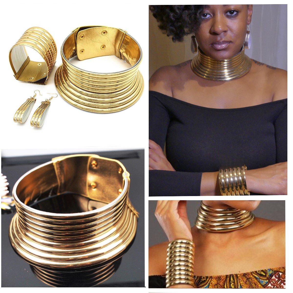 The full expression. The power look. The Ndebele Choker is a sculptural gold-tone collar inspired by traditional African neck rings—designed to frame the shoulders and elevate even the simplest look.